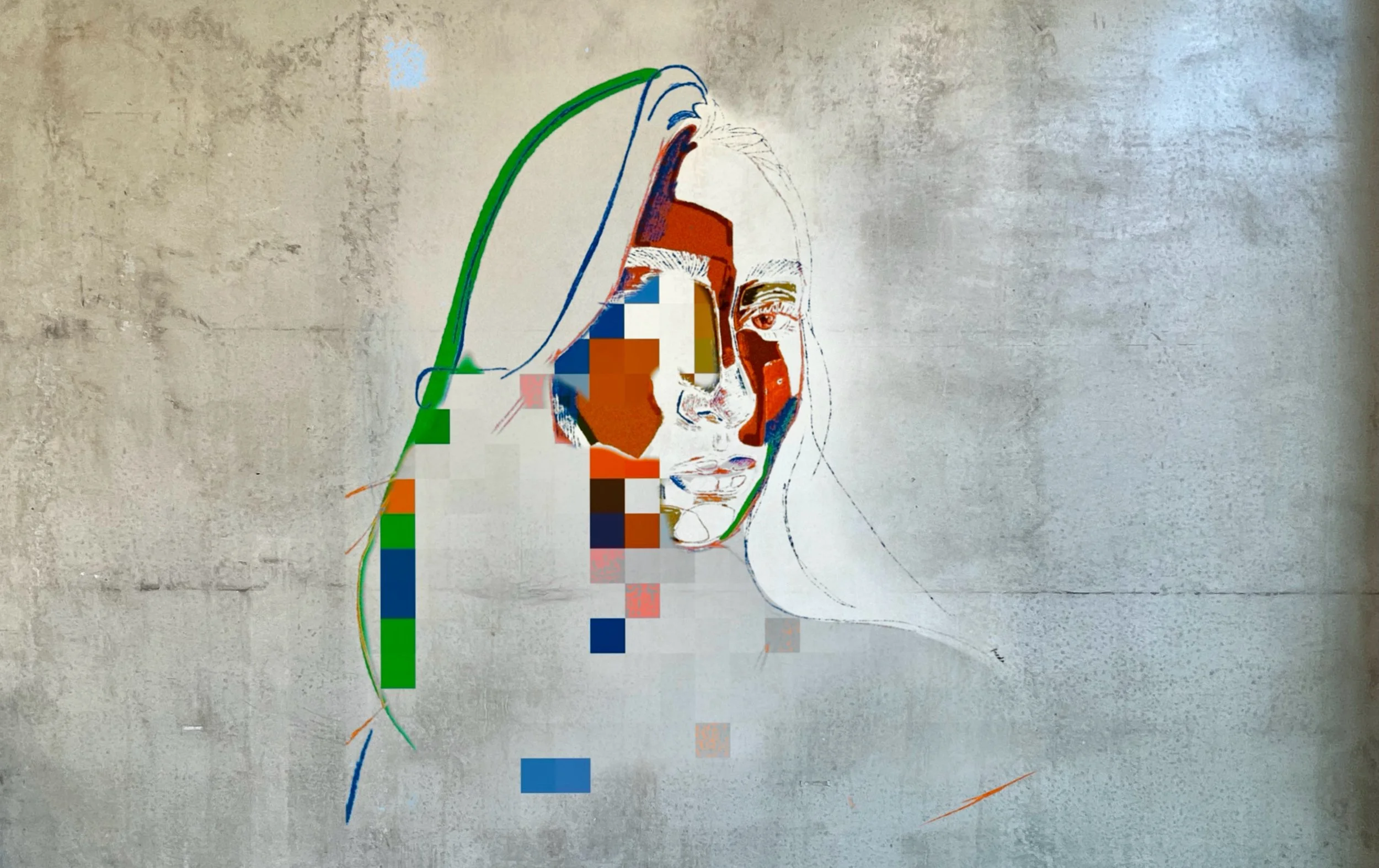 The colour palette, both faded and jarring, recalls memory worn by time. Combined with the pixelation, the work exists in two temporal registers: the analog fading of nostalgia and the digital disassembly of perception. Past and present converse across the image. The colours and forms act as residue. What fades, stains, or endures when appearances lose their certainty.